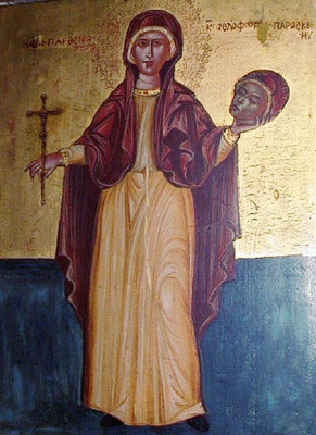 La testa in mano sta a significare il martirio subito per ordine del tiranno Massimiliano nel secolo 312 DC. |