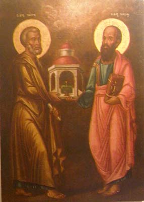 La testa in mano sta a significare il martirio subito per ordine del tiranno Massimiliano nel secolo 312 DC. |