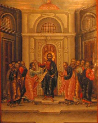 La testa in mano sta a significare il martirio subito per ordine del tiranno Massimiliano nel secolo 312 DC. |