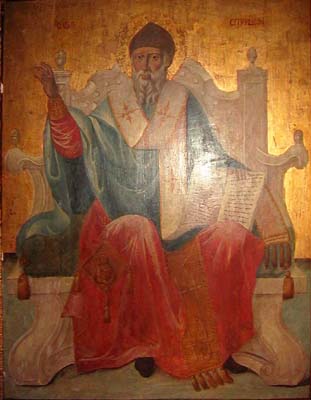 Vescovo di Trimisunte (303-348), tra i taumaturghi della chiesa greca onorò la chiesa. Partecipò al consiglio di Nicea 325 distinguendosi per lo spirito combattivo contro l'areanesimo. Per